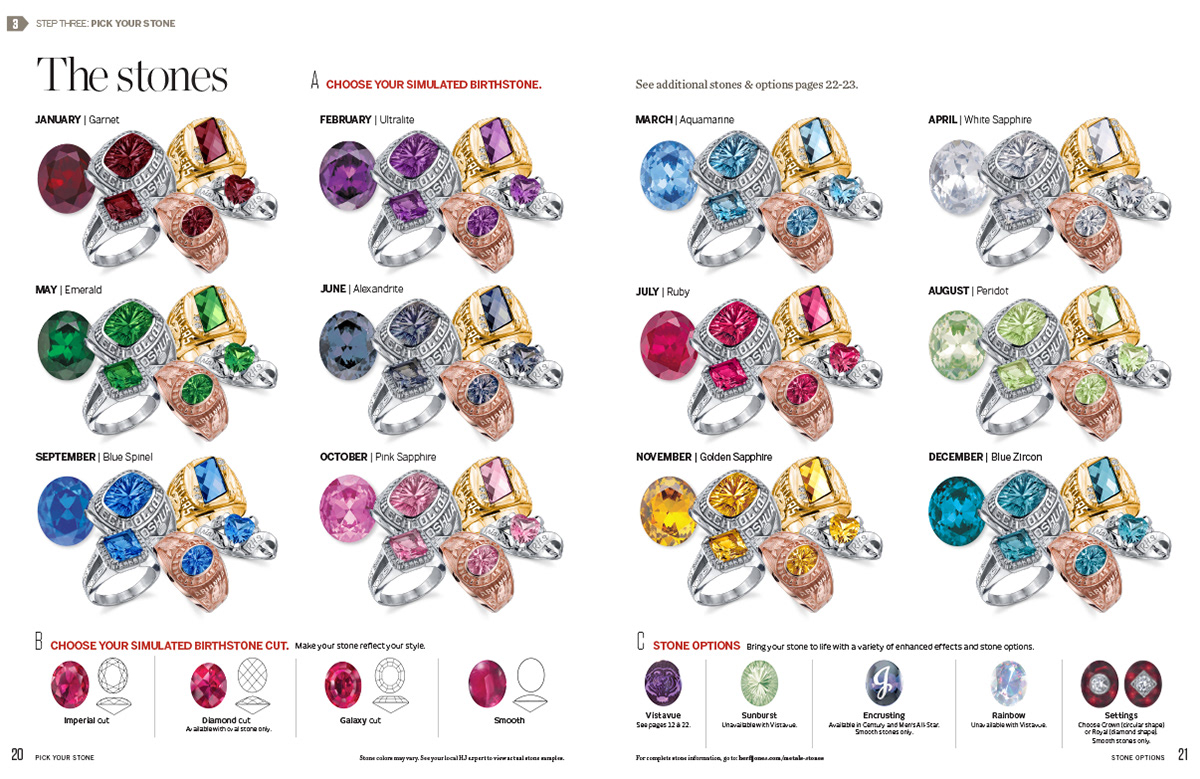 One catalog is entirely focused on class rings, while the other is focused on products for seniors and has two variants: one with apparel included, and one without. Some sales partners have varying apparel offerings, and prefer to use a catalog that excludes these items to avoid customer confusion.