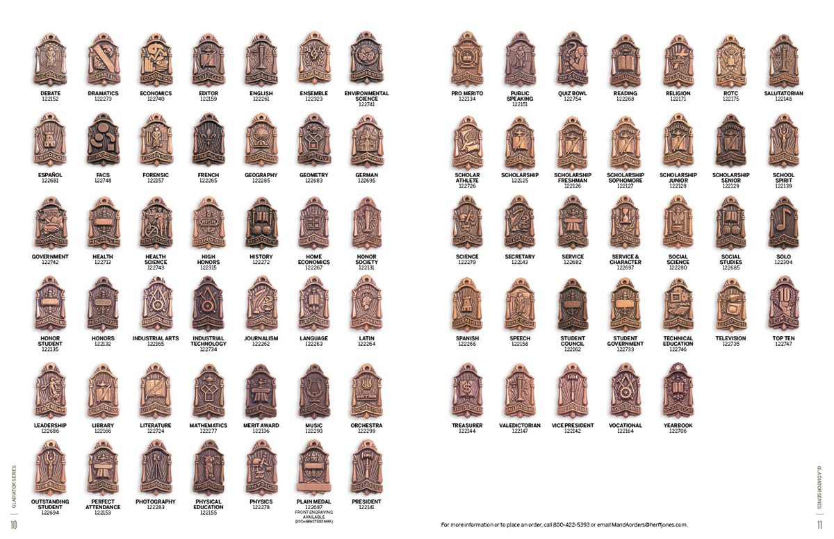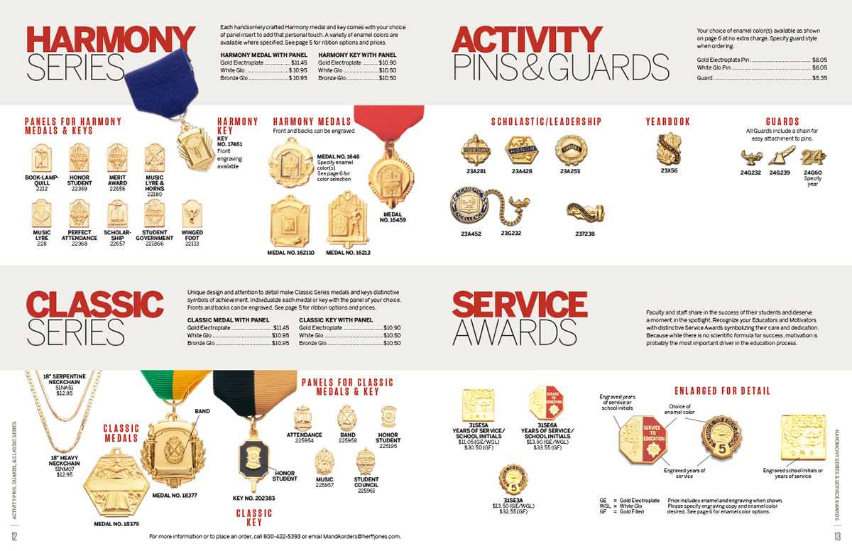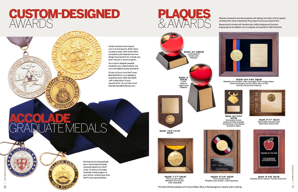 This was a stylistic update to the Herff Jones Medals & Awards catalog, which I had overhauled in 2018, but our brand had shifted in the years since. Headers and text were moved to horizontal blocks instead of columns on the page edge, and our primary typeface was shifted from Tungsten to Benton Sans. We also updated the cover to match our Class of 2023 high school catalogs, the back cover to a simple photo (rather than a product cluster), and had all-new photography of our plaques and trophies (several of which had simply been updated in Photoshop for years). As a bonus, our Assistant Creative Director got to model as a teacher, which helped add a human element to an otherwise very product-focused piece.