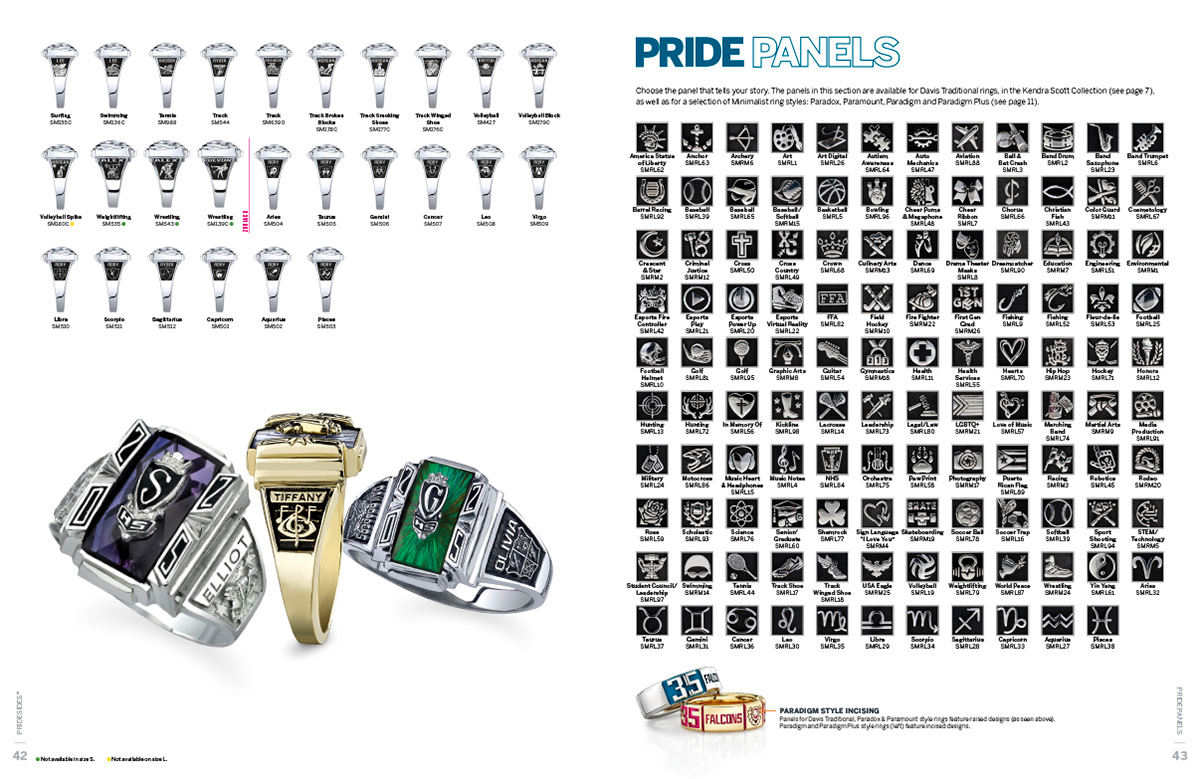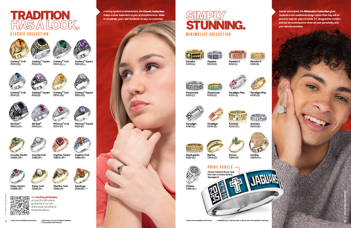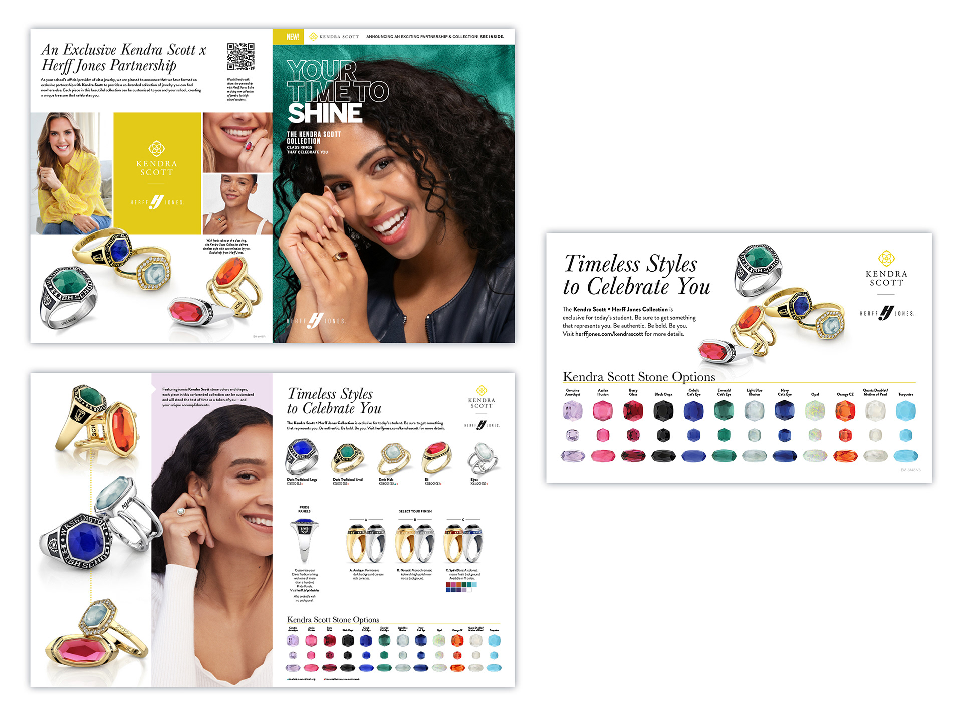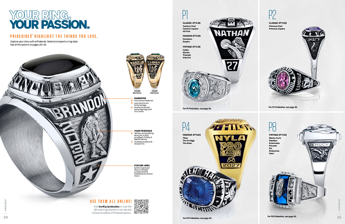 A significant change for 2025 was a partnership between Herff Jones and Kendra Scott, a fashion jewelry brand. Every catalog that included the new collection had a callout on the cover, but then we additionally pulled the pages about the partnership out to produce a standalone 4-pager and a postcard (shown right).