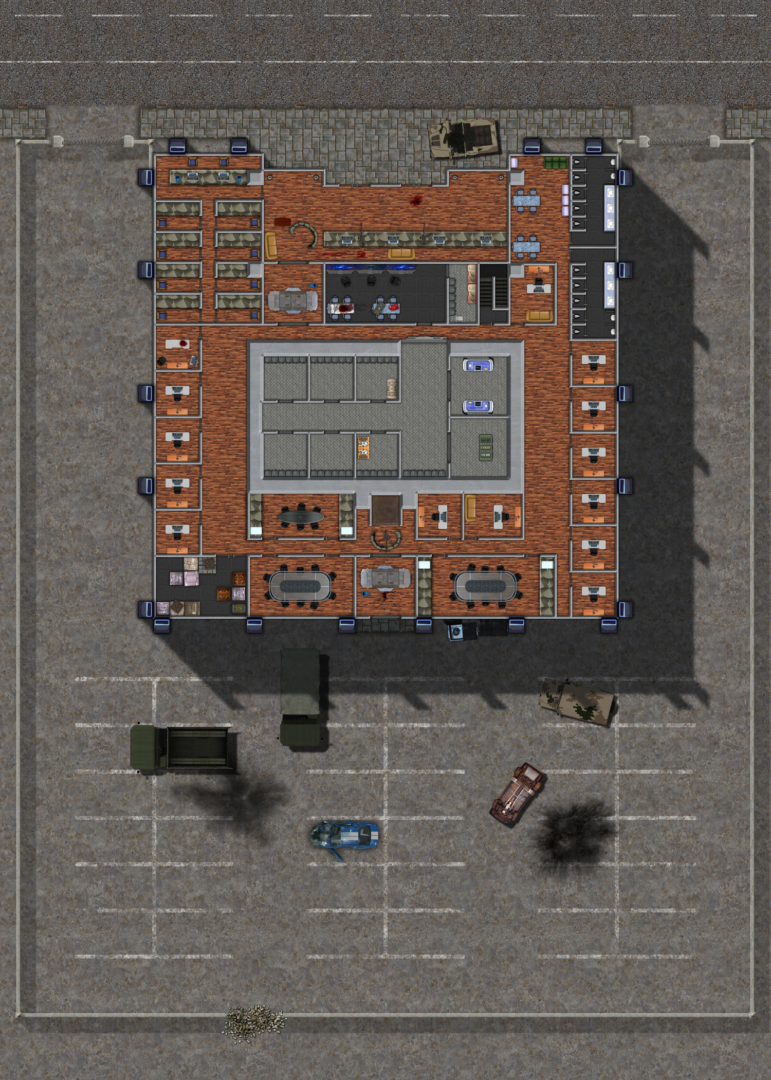 Both versions of this map featured a helipad, upper level offices, and ground floor with lobby, vault, and offices. The clean version also featured a secret hallway leading to a large elevator, which concealed an underground facility for developing a powerful AI core. This map was 50 x 70 grid squares (representing 100 by 140 meters), and set up to allow any number of different approaches by my players. I run games in a very sandbox style, where there are no predetermined outcomes or right answers, so I wasn't certain how my players would enter the bank or bypass security.